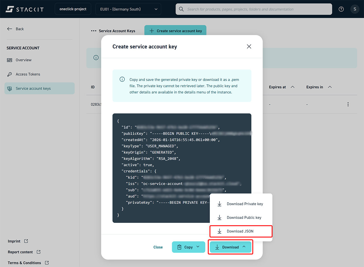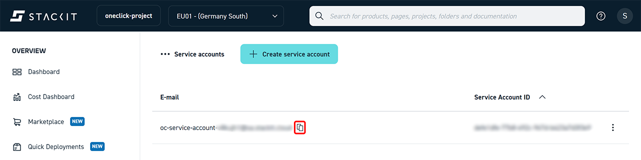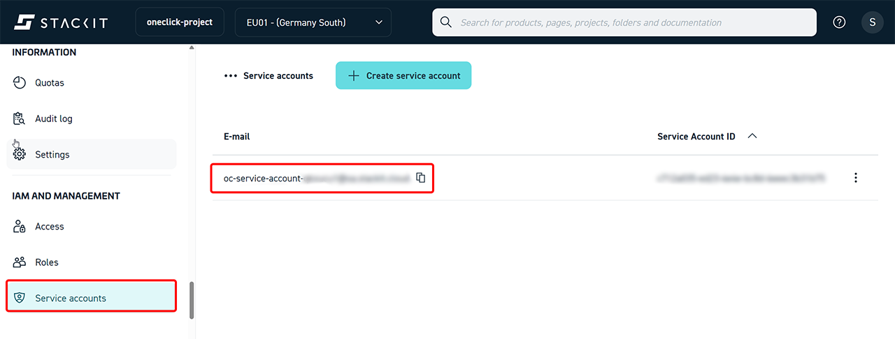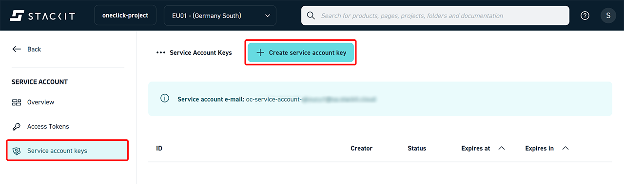 Damit oneclick™ sich bei StackIT authentifizieren kann, müssen Sie Zugangsdaten für den Service Account erzeugen.