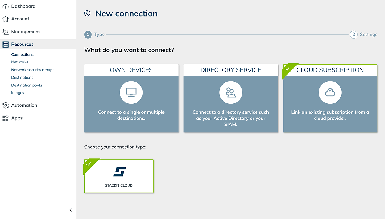 - Wählen Sie die Kachel Cloud-Abonnement und anschließend StackIT Cloud.