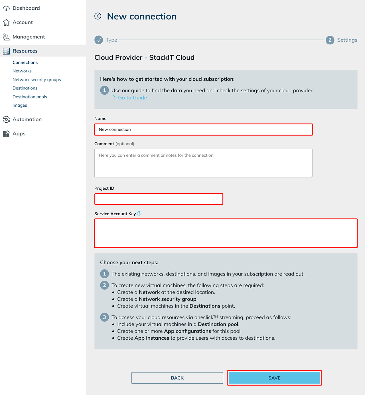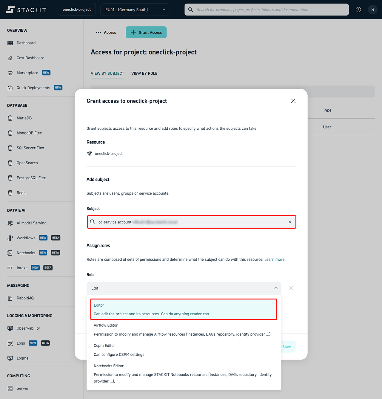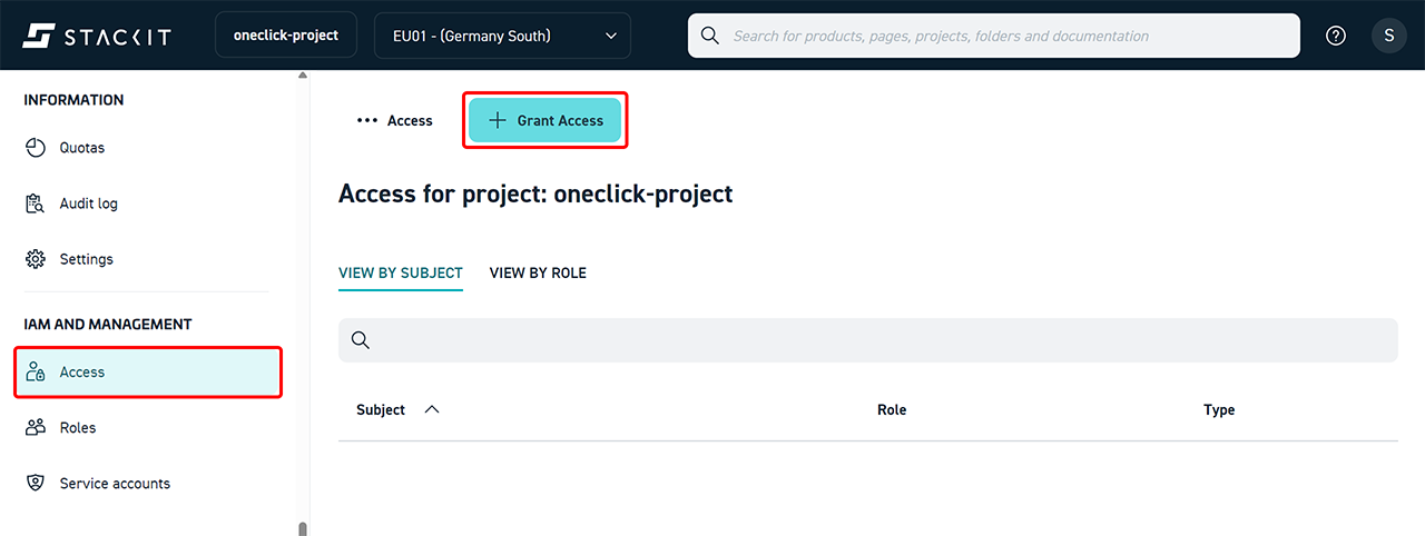 Möchten Sie ein bereits vorhandenes StackIT-Abonnement in oneclick™ nutzen, muss oneclick™ über die StackIT-APIs auf dieses Projekt zugreifen können.
