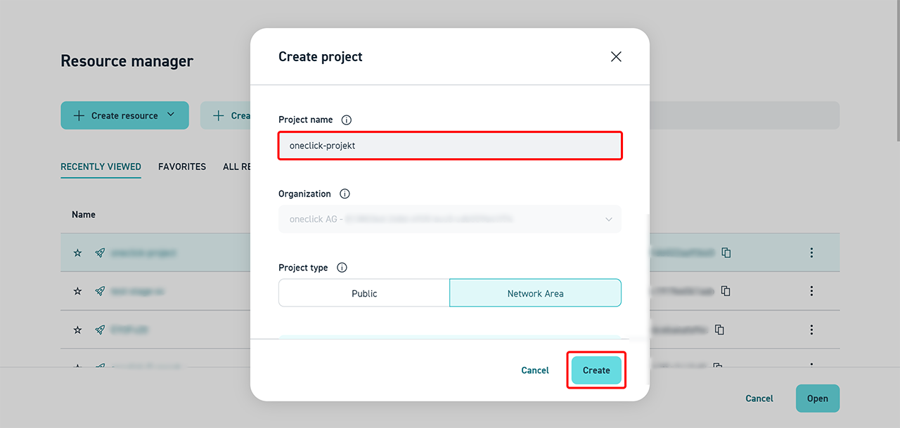 - Vergeben Sie einen Projektnamen, weisen Sie das Projekt der gewünschten Organisation zu, wählen Sie einen Projekttyp aus und klicken Sie auf Erstellen.