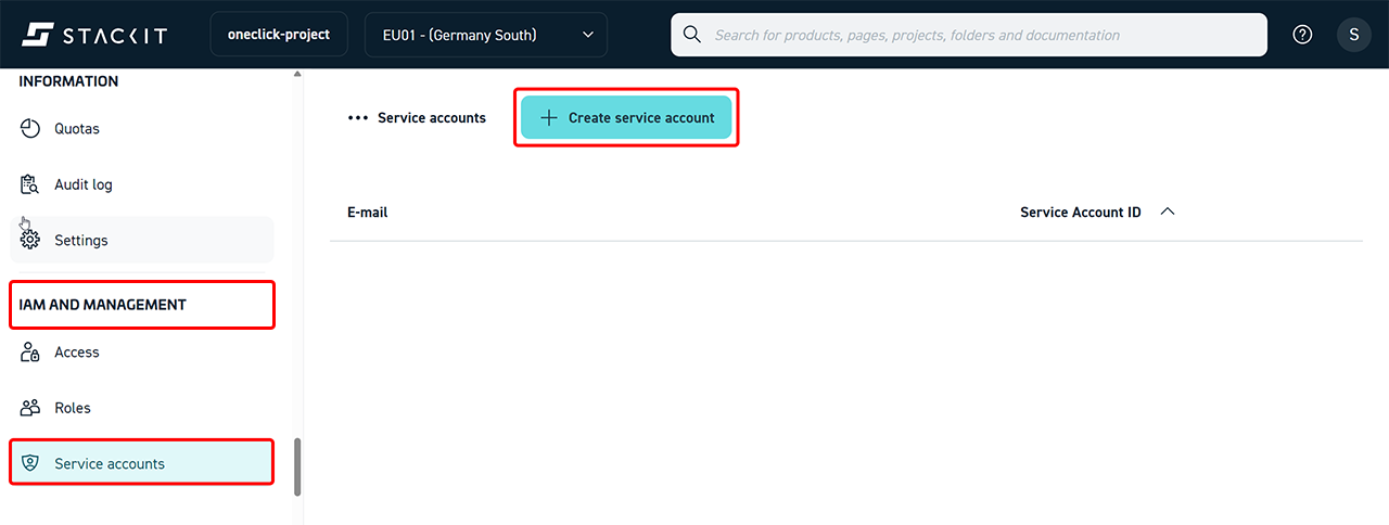 Im folgenden Schritt erstellen Sie einen StackIT Service Account und weisen ihm die in Abschnitt 2 beschriebenen IAM-Berechtigungen für Ihr Projekt zu.