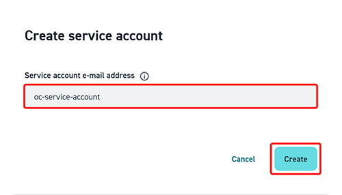 - Vergeben Sie einen eindeutigen Namen, z. B. "oc-service-account". Es muss nur der Name (Prefix) angegeben werden. Die vollständige Service-Account-E-Mail-Adresse wird von StackIT automatisch generiert und dem Service Account zugewiesen.