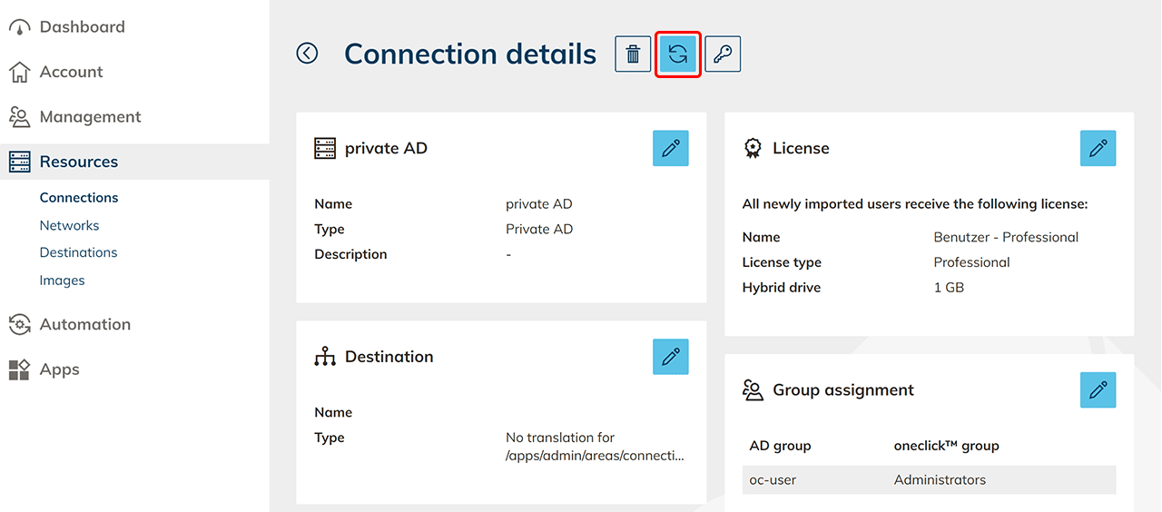 - Klicken Sie im Menüpunkt „Ressourcen“ auf den Reiter Anbindungen.
