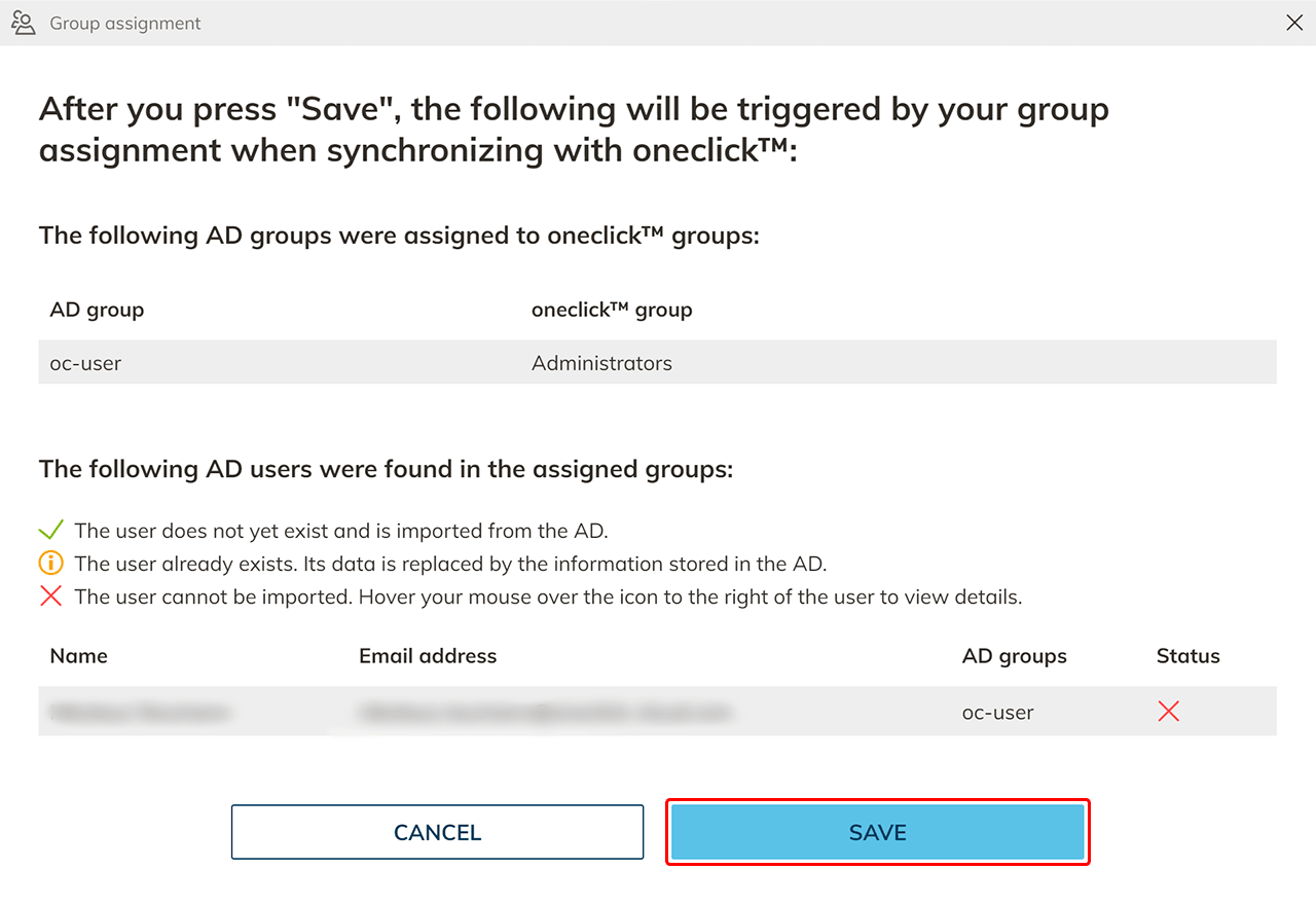 - Kontrollieren Sie die Gruppenzuweisung und die Daten Ihrer Benutzer. Ihnen wird angezeigt, welche Daten in oneclick™ importiert oder verändert werden. Klicken Sie auf Speichern. Wenn Sie eine neue Gruppe aus dem Active Directory in oneclick™ importieren möchten, wiederholen Sie den Import-Vorgang wie Hier beschrieben.