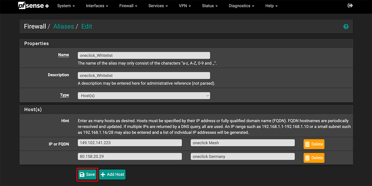 - Im Abschnitt „Quelle“ tragen Sie als „Typ“ Einzelner Host oder Alias und in dem Feld rechts daneben die „Adresse“ oneclick_Whitelist ein.