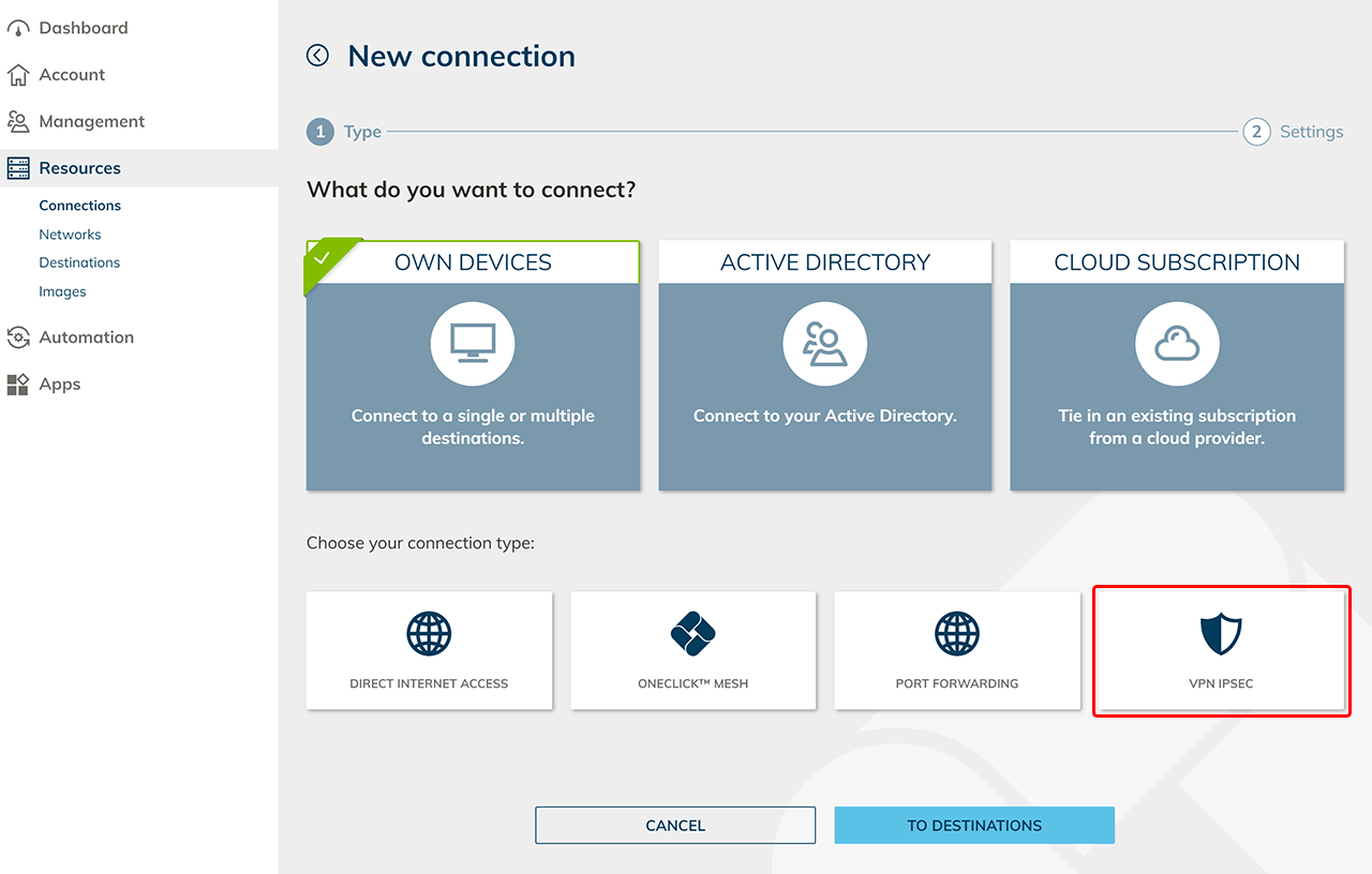 - Wählen Sie unter Eigene Geräte die Kachel VPN IPsec aus.