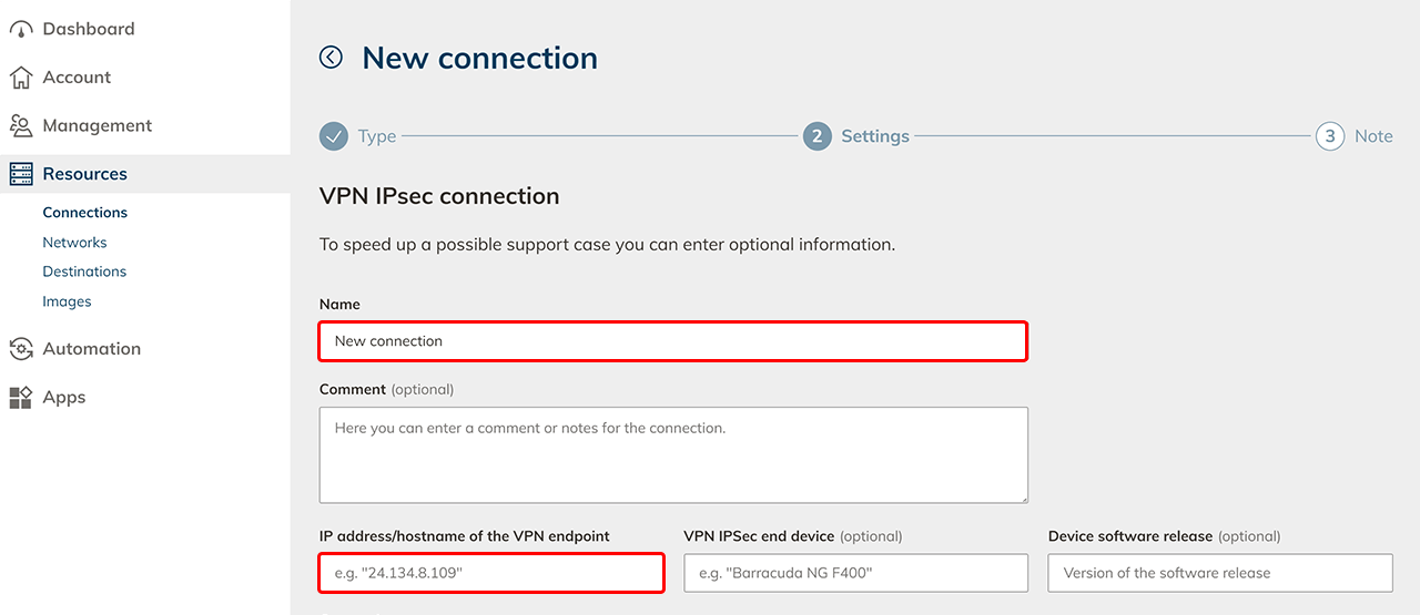 - Geben Sie der neuen Verbindung einen beliebigen Namen und tragen Sie die IP-Adresse oder DNS des VPN Endgerätes ein. Optional nehmen Sie Eintragungen in den Feldern VPN IPsec Endgerät und Device Software Release vor.