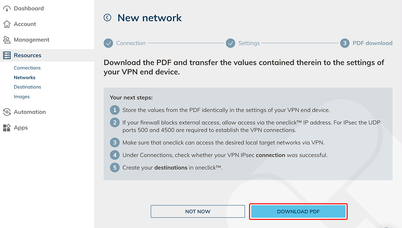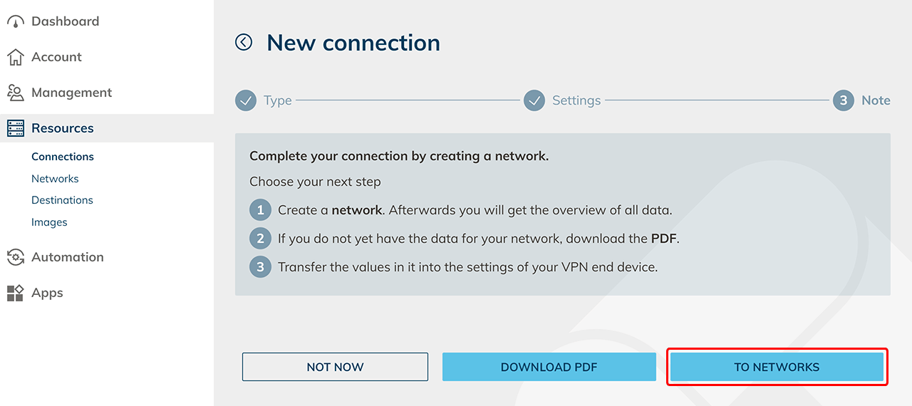 - Wenn Ihnen Ihre Netzwerkdaten vorliegen, erstellen Sie sofort ein Netzwerk und nehmen den direkten Weg über den Button Zu Netzwerke. Liegen Ihnen noch keine Netzwerkdaten vor, können Sie das PDF herunterladen und die bereits enthaltenen Einstellungen in Ihrem VPN Endgerät vornehmen.
