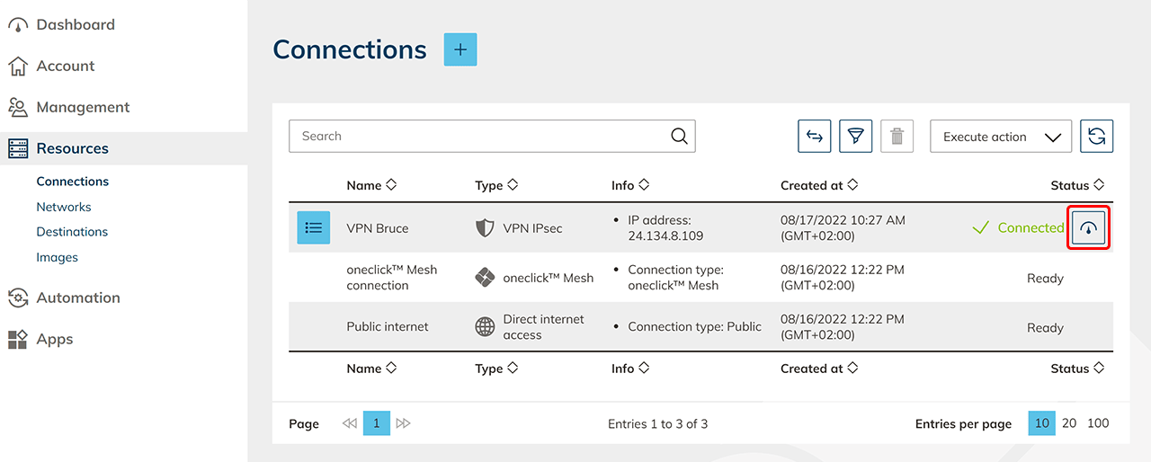 Klicken Sie auf das Status-Überprüfen-Symbol in der Zeile, um die Konnektivität zu überprüfen.
