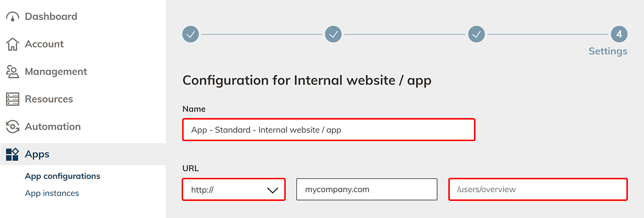 - Wählen Sie zwischen HTTP oder HTTPS und tragen den Pfad der internen Webseite ein.