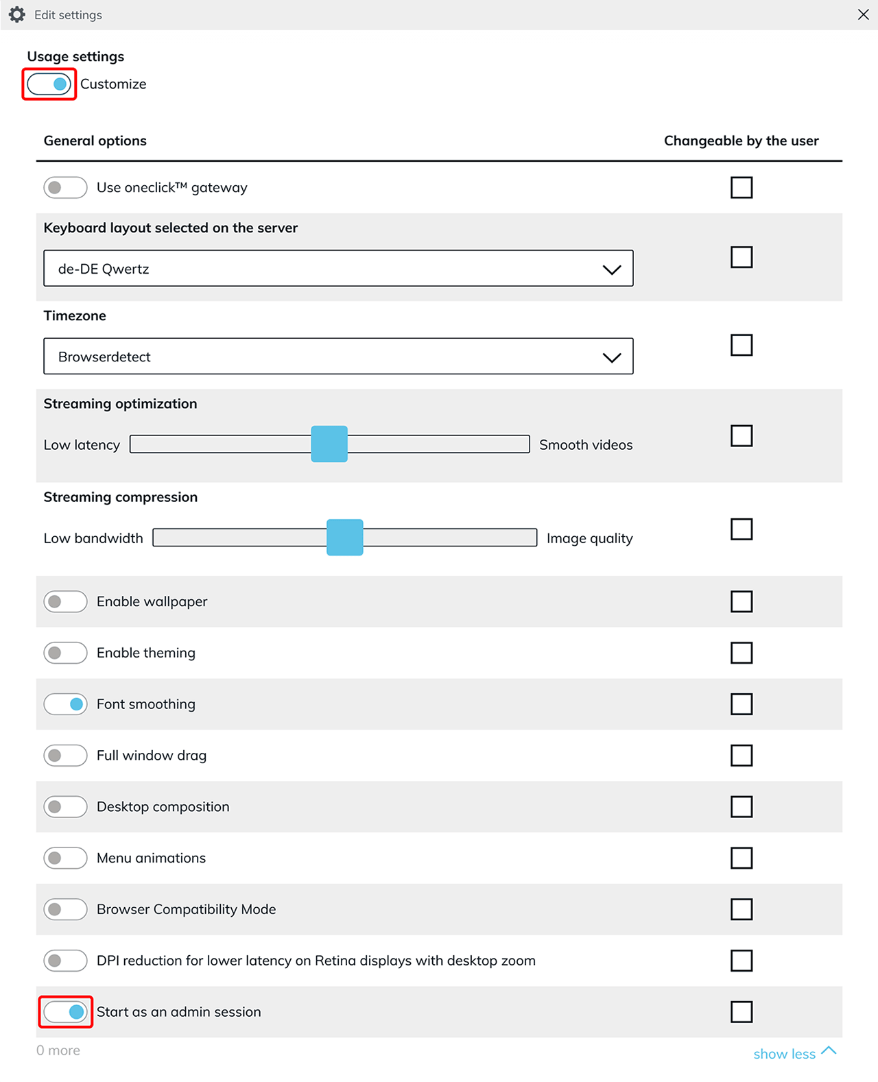 Mit der Option Als Admin-Session starten wird eine administrative Verbindung hergestellt, die unabhängig von CAL-Lizenzen funktioniert und für Wartung oder Anpassungen an der Konfiguration genutzt werden kann.