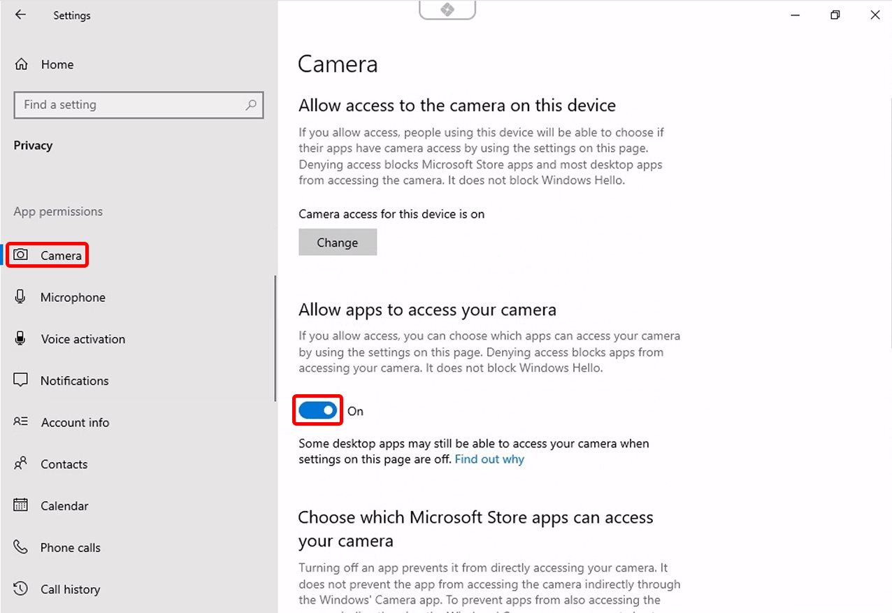 Um die Einstellungen für Ihre Webcam vorzunehmen, wechseln Sie zu Start > Einstellungen > Datenschutz > Kamera: