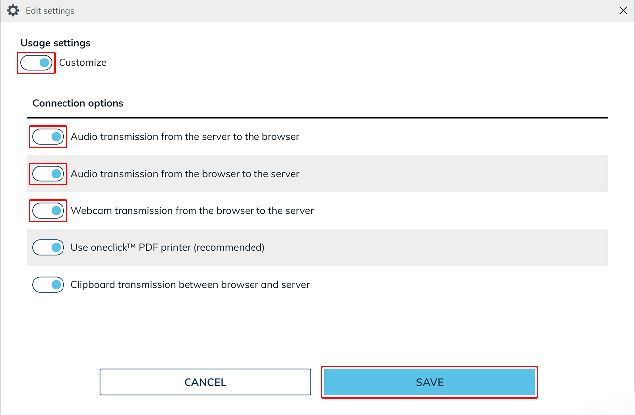 - Aktivieren Sie unter „Verbindungseinstellungen“ die Punkte Audioübertragung vom Server zum Browser und Audioübertragung vom Browser zum Server. Mit Aktivierung des Schalters neben dem Punkt Webcam-Übertragung vom Browser zum Server geben Sie an dieser Stelle zusätzlich den Zugriff auf die Kamera frei.