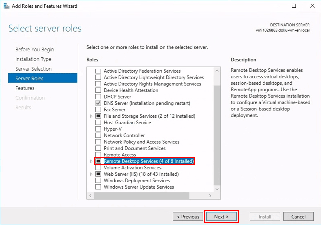 - Wählen Sie im Schritt "Serverrollen" Remotedesktopdienste aus und klicken Sie auf Weiter.