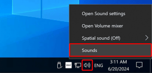 - Öffnen Sie den Windows Server, auf den Sie über oneclick™ zugreifen, und klicken Sie unten rechts in der Taskleiste mit der rechten Maustaste auf das Sound Symbol und klicken Sie dann auf Sounds.