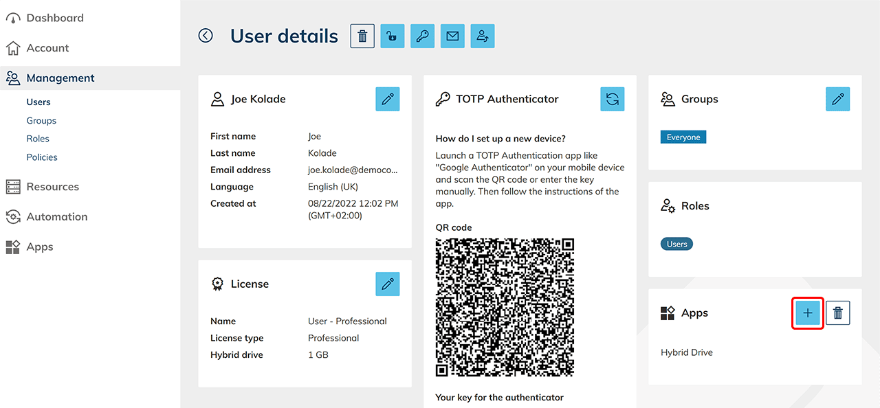 Klicken Sie im Menü auf den Reiter Verwaltung und dann auf Benutzer. Klicken Sie in der Zeile des Benutzers, dem Sie Apps zuweisen möchten, auf das Listen-Symbol, um auf die Detailseite zu gelangen.