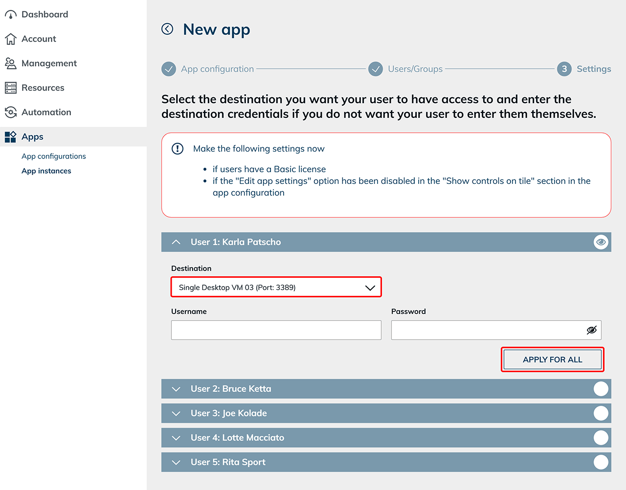 - Wenn mehrere Benutzer dasselbe Zielsystem und/oder dieselben Zugangsdaten erhalten sollen, klicken Sie auf den Button ”Für alle übernehmen”. Dadurch werden die aktuell eingegebenen Zielsystem- und Zugangsdaten automatisch auf alle Benutzer in der Liste übertragen. Der Button wird nur angezeigt, wenn mehr als ein Benutzer vorhanden ist.