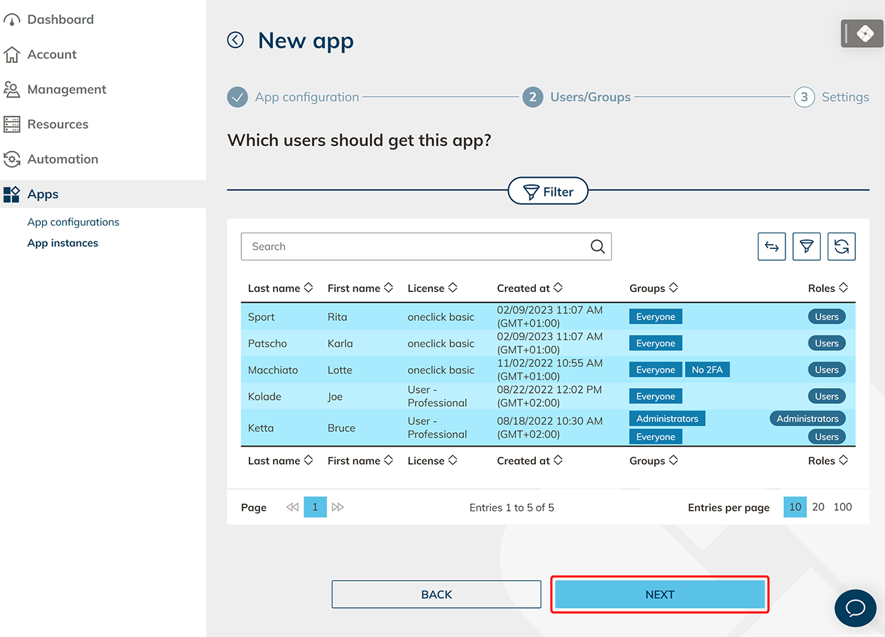 Wählen Sie die App-Konfigurationen aus, von denen der Benutzer eine Instanz erhalten soll und klicken auf Weiter.