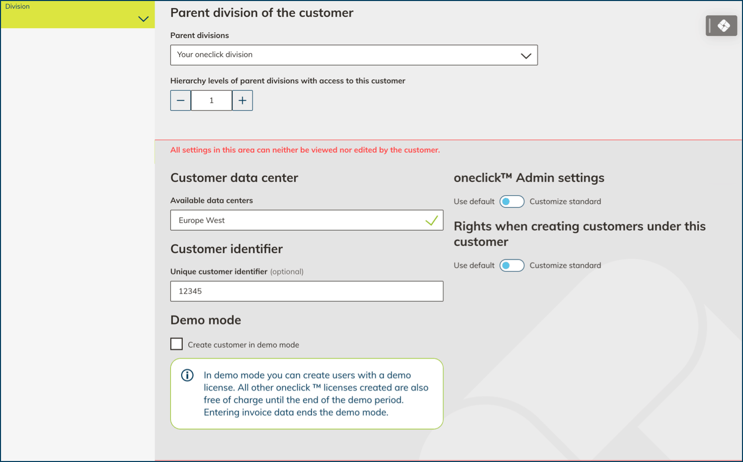 - Wenn Sie das Recht besitzen, können Sie Einstellungen für die "Rechte beim Anlegen von Kunden unter diesem Kunden" vornehmen. Im Standard ist nur "Aktivieren des Demo-Modus" aktiviert.