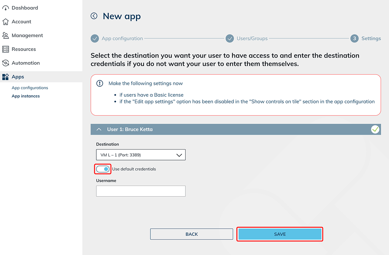 - … und erstellen dann App-Instanzen für Ihre oneclick™ Benutzer. Beim Erstellen der App-Instanz erkennen Sie, ob Standard-Zugangsdaten hinterlegt sind. Lassen Sie den Schiebeschalter in den Einstellungen aktiviert, wenn Ihre Benutzer die Standard-Anmeldedaten verwenden sollen. Abhängig von den hinterlegten Standard-Zugangsdaten wird in diesem Fall nur das leere Eingabefeld angezeigt, das nicht vorausgefüllt wurde. Wird kein Feld angezeigt, sind sämtliche Anmeldedaten bereits hinterlegt.
