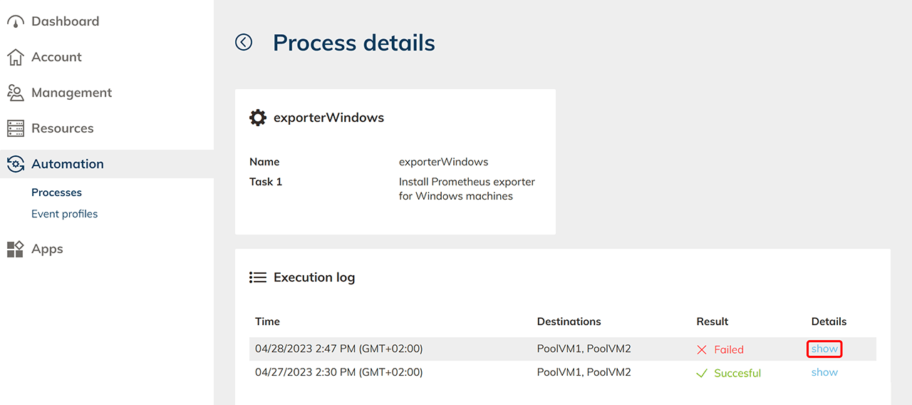 - Wurde der Prozess „exporterWindows“ erfolgreich ausgeführt? Um mehr Infos zu der Ursache zu erhalten können Sie wie folgt den Prozessverlauf einsehen.