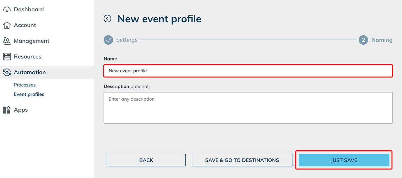 - Vergeben Sie einen eindeutigen Namen für das Eventprofil und klicken Sie auf Speichern.