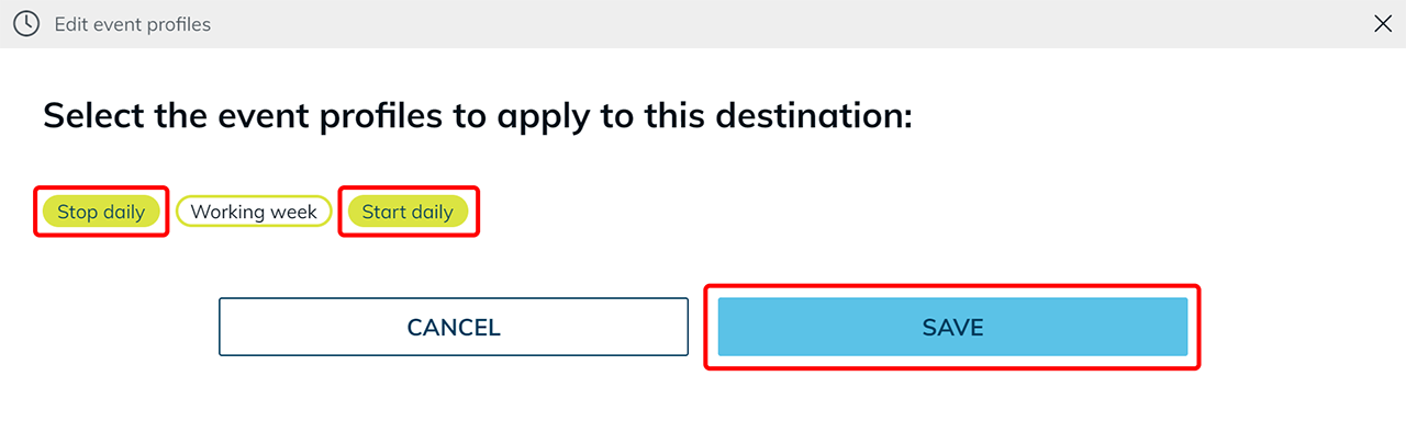 Das Eventprofil wird gemäß der definierten Zeitplanung auf die ausgewählte Ressource angewendet. Wird ein Event nicht wie erwartet ausgeführt, prüfen Sie die hinterlegte Zeitzone, die definierten Uhrzeiten sowie die Zuordnung des Eventprofils zur Ressource.