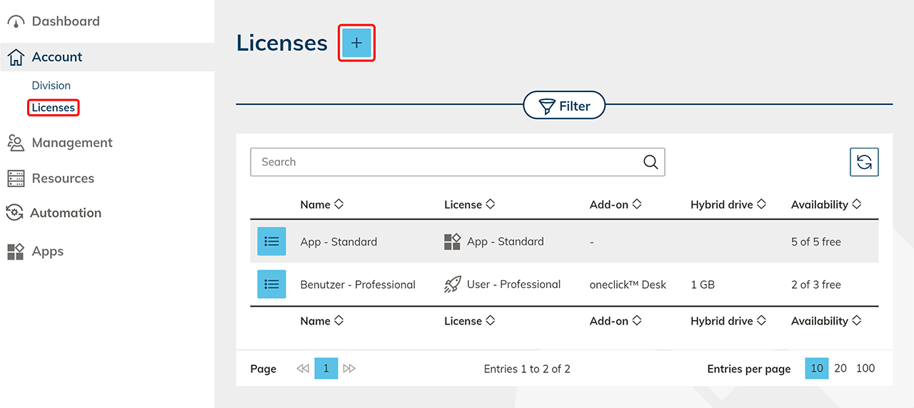 Klicken Sie im Reiter Account auf Lizenzen und dann auf das + Symbol , um eine neue Lizenz zu erstellen.