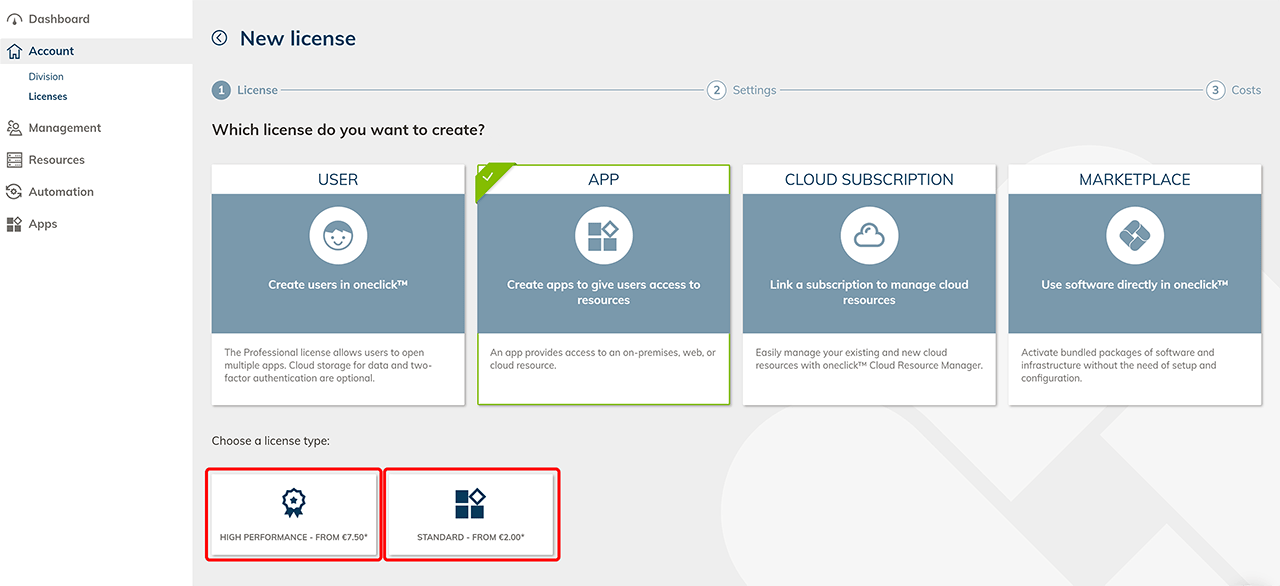 Geben Sie der Lizenz einen beliebigen Namen und wählen Sie so viele App-Lizenzen, wie Sie Apps an Ihre Benutzer vergeben möchten. Bei der Standard-App können Sie einen zweiten Monitor hinzubuchen.