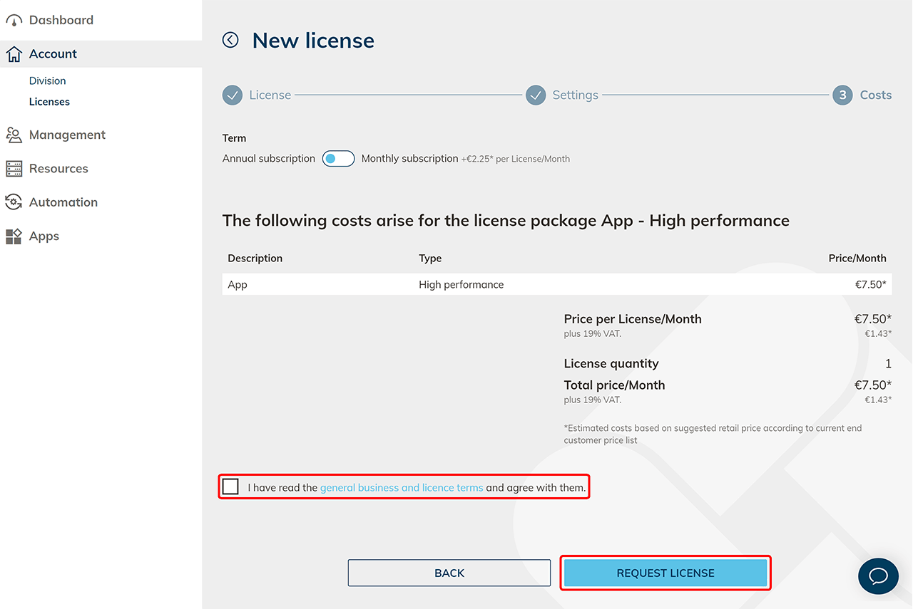 Im letzten Schritt bekommen Sie alle Kosten genau aufgelistet. Klicken Sie auf Lizenz anfordern, um den Vorgang abzuschließen