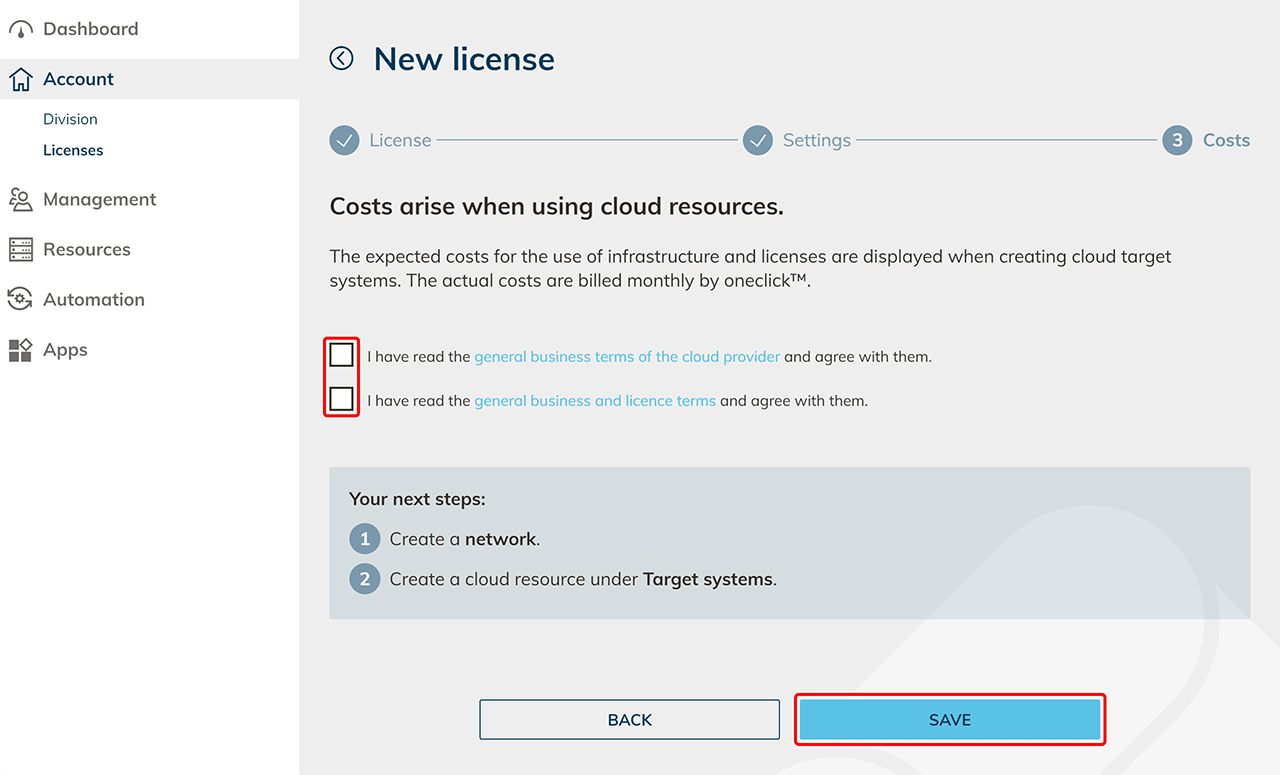Die Nutzungskosten für die Cloud-Infrastruktur werden Ihnen direkt von oneclick™ in Rechnung gestellt und nicht vom Cloud-Provider. Die Cloud-Nutzungskosten können im Vorfeld nicht eingeschätzt werden. Beachten Sie hierfür die Preise des Cloud-Providers.