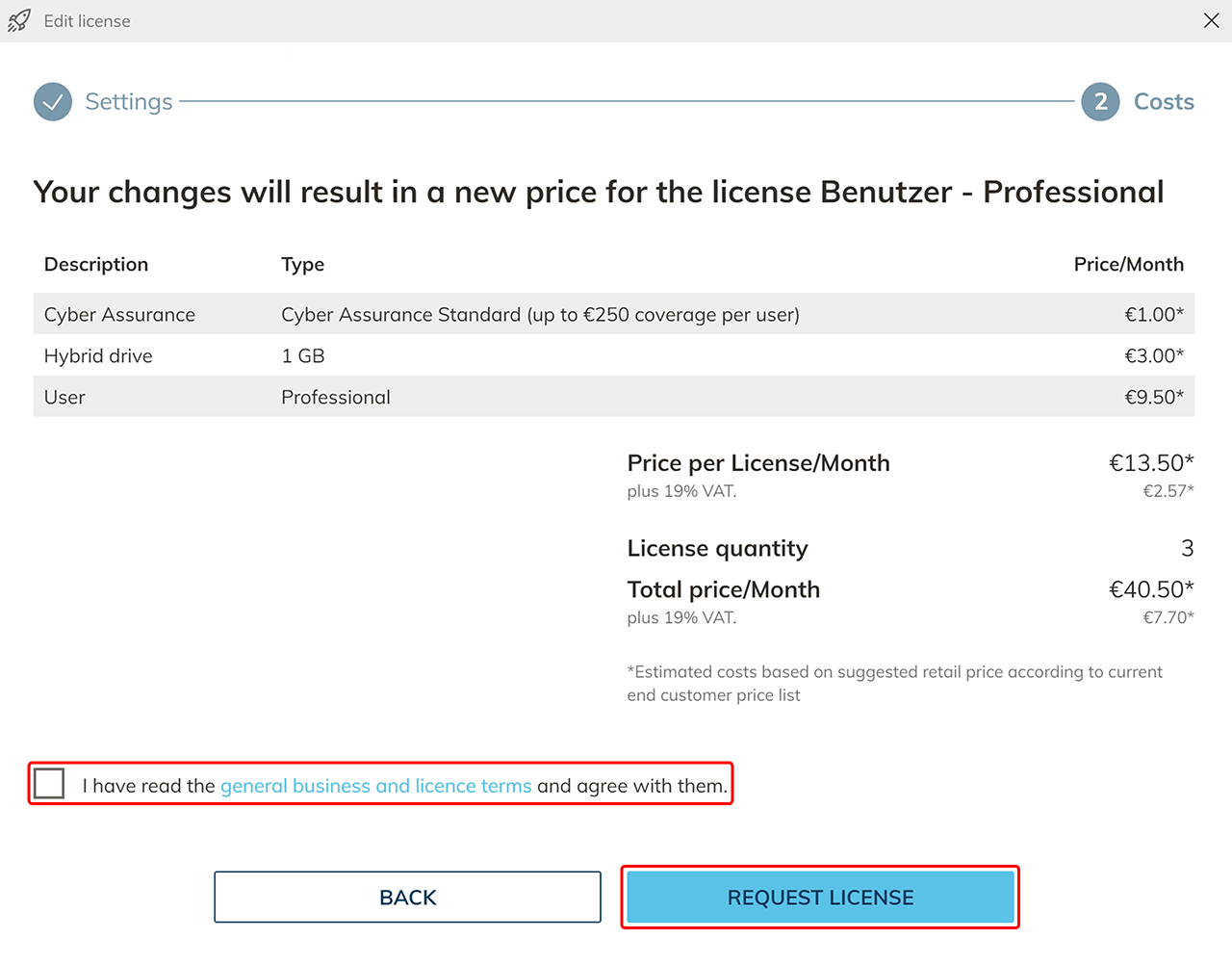 - Sie bekommen die geänderten Kosten aufgelistet. Klicken Sie auf Lizenz anfordern, um den Vorgang abzuschließen. Ihre gekündigten Lizenzen reduzieren sich nun um die Menge, die Sie hinzugekauft haben.