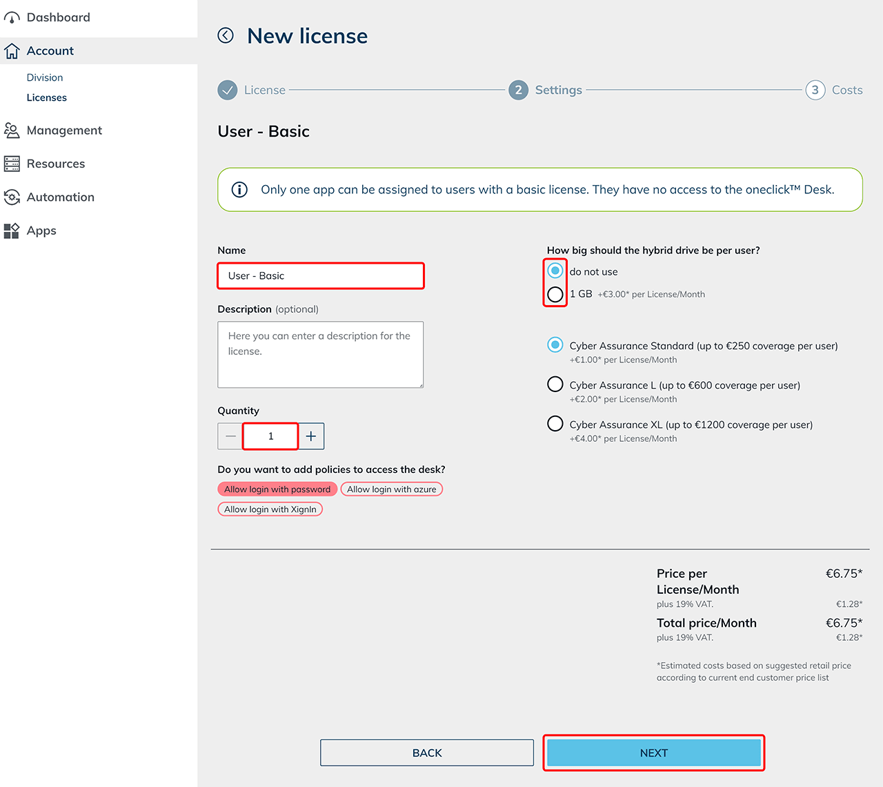 - Professional: Wählen oder kombinieren Sie Richtlinien um z.B. den Login über Identity Provider zu erlauben. Die Richtlinie "Login erlauben mit Passwort" wird beim Kauf einer Lizenz grundsätzlich immer aktiviert und ermöglicht dem Benutzer den Zugriff über seine oneclick™ Zugangsdaten. Beachten Sie bitte unseren Help-Artikel zur Deaktivierung dieser Richtlinie, falls Ihren Benutzern der Zugriff ausschließlich über einen Identity Provider oder ein privates Active Directory erlaubt werden soll. Weiterhin können Sie in diesem Schritt verschiedene Größen für das Hybrid Drive auswählen. Klicken Sie anschließend auf Weiter.
