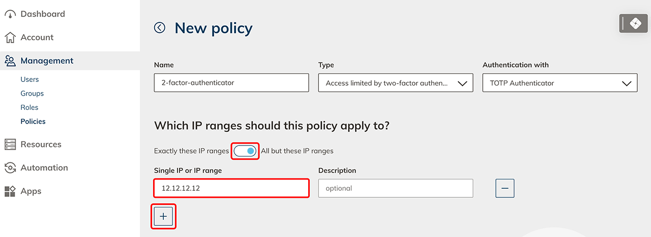 - Alle außer diese IP-Bereiche Wählen Sie diese Option, wenn Sie den Zugriff nur für bestimmte IP-Bereiche zulassen oder unbeschränkt lassen möchten. Beispielsweise können Sie den zweiten Faktor für alle Benutzer im Home Office aktivieren, indem Sie die Option „Alle außer diese IP-Bereiche“ aktivieren, auf das + Symbol klicken und hier die IP-Adresse Ihres Büros eintragen.