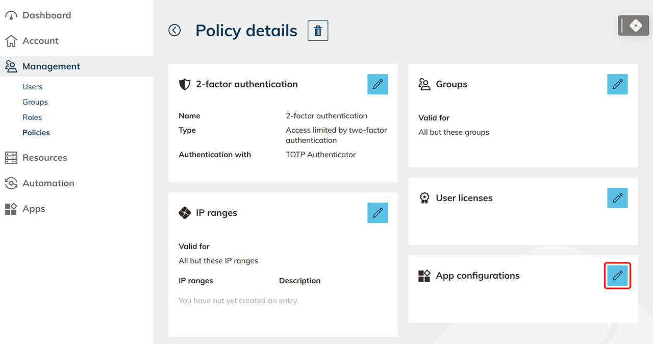 Mit Hilfe von "Richtlinien" können Sie den oneclick™ Unified Workspace oder sensible Apps zusätzlich absichern. Sie können den Zugriff von IP-Adressen/Bereichen verbieten oder mit einer Zwei-Faktor-Authentifizierung beschränken. Sie können später beliebig viele Richtlinien miteinander kombinieren, indem Sie in einer App-Konfiguration oder einer Benutzer-Lizenz mehrere Richtlinien auswählen.