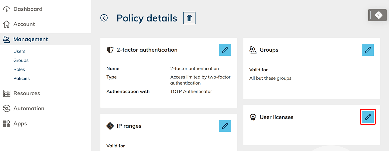 - Klicken Sie in der Kachel „Benutzerlizenz“ auf das Stift-Symbol.