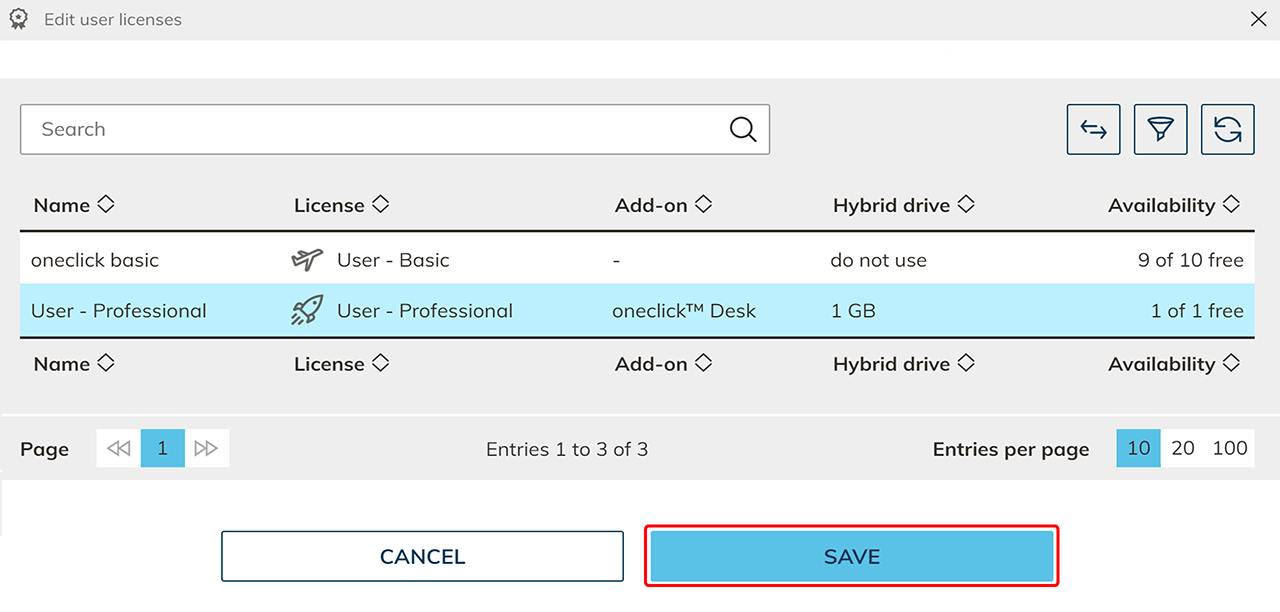 - Wählen Sie eine oder mehrere Benutzerlizenzen aus und beenden Sie den Vorgang mit Klick auf Speichern. Die Richtlinie greift nun beim Einloggen der Benutzer.