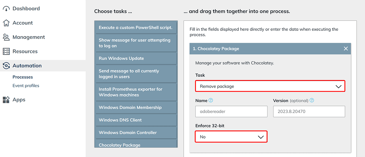 Mit Chocolatey können Sie Software durch einen zentral ausgeführten Prozess auf Ihren Ressourcen ebenfalls deinstallieren. Wir empfehlen hierzu, ein Prozess-Template anzulegen, bei dem dann nach Bedarf jede Software eingetragen werden kann.