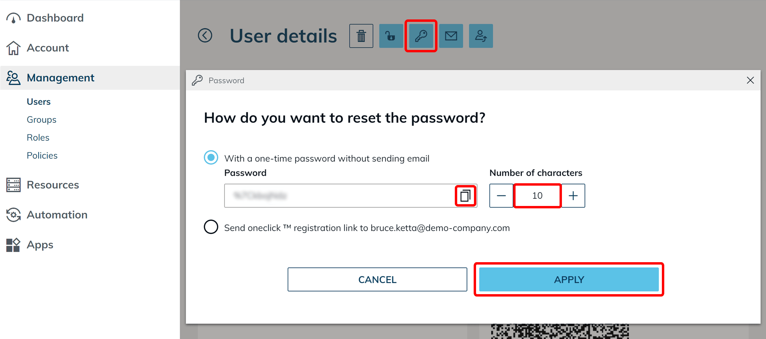 - Sollte die hinterlegte Email-Adresse nicht korrekt sein, oder der Zugang zu dieser nicht möglich, haben Sie die Möglichkeit, über oneclick™ ein Einmalpasswort für Ihre Benutzer vergeben.