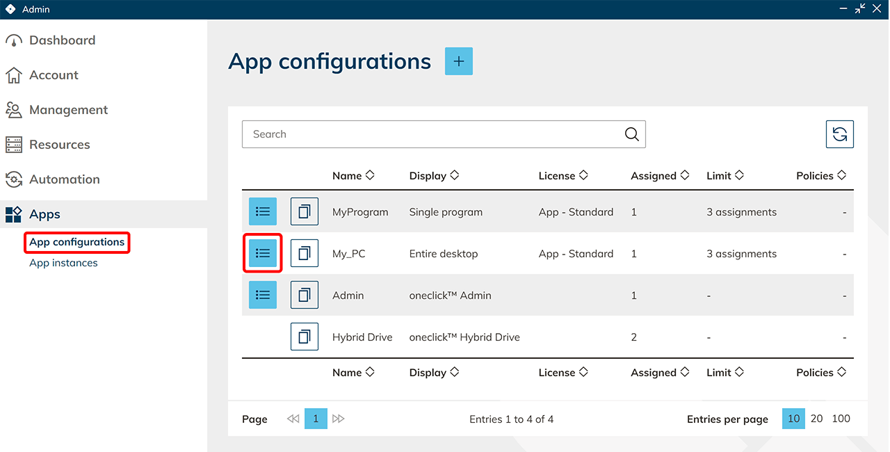 - Wählen Sie Ihre App-Konfiguration aus und klicken Sie auf das Listen-Symbol um auf die Detailseite zu gelangen.