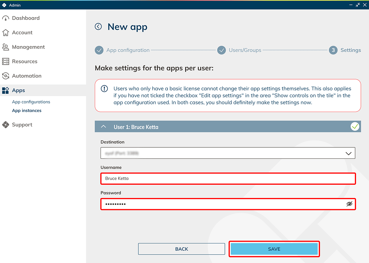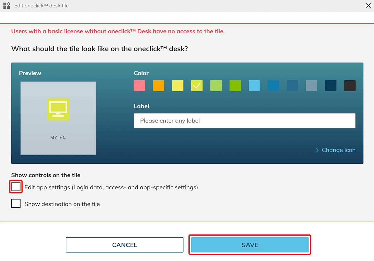 - Kontrollieren Sie, ob „App-Einstellungen bearbeiten” deaktiviert ist und klicken Sie auf Speichern. Dies garantiert, dass der Benutzer die Logindaten für die virtuelle Maschine weder sehen noch eingeben kann.
