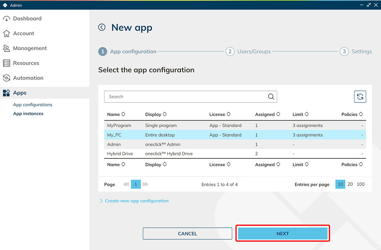 - Wählen Sie die App-Konfiguration, aus der eine App-Instanz erzeugt werden soll und klicken auf Weiter.