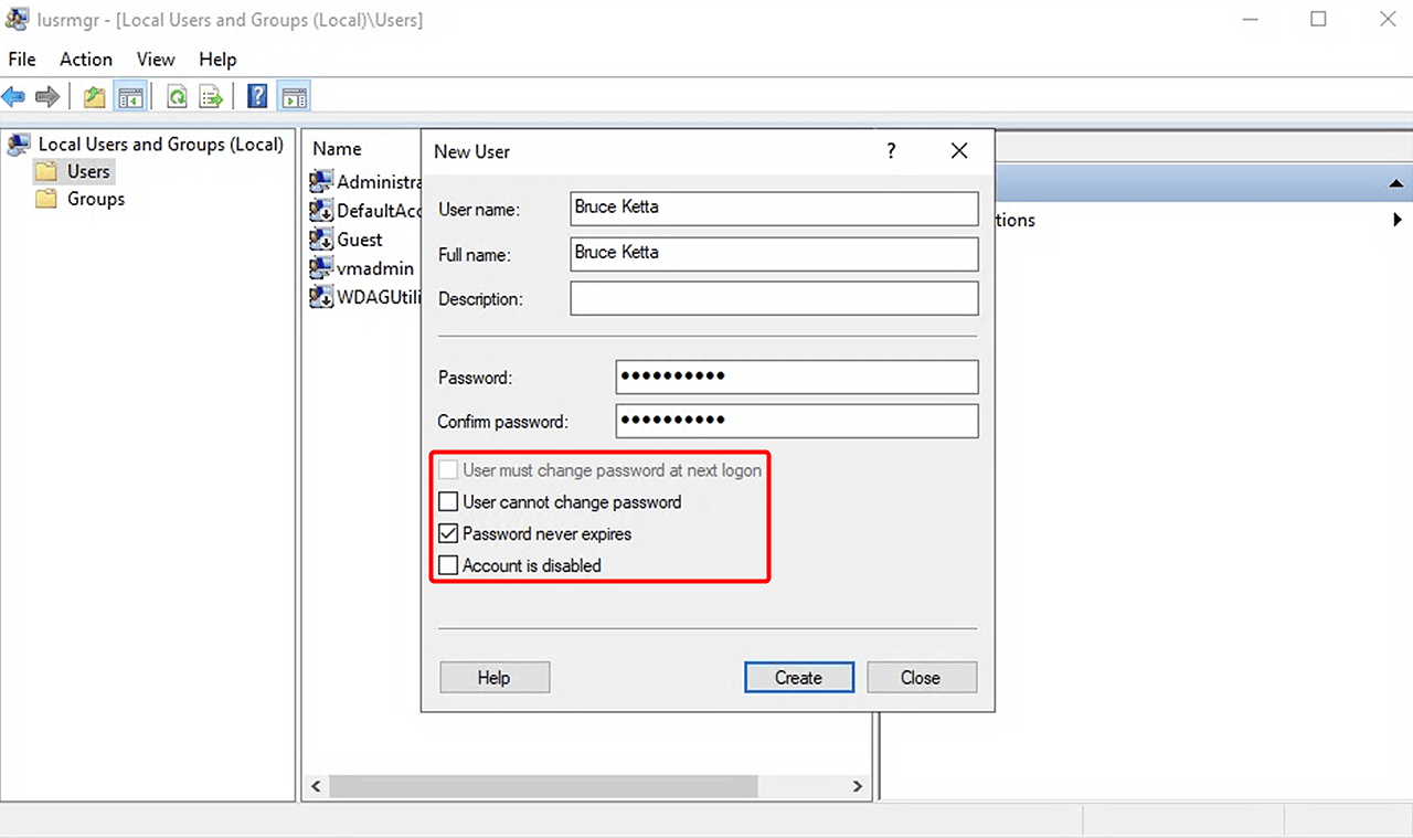 Geben Sie einen "Benutzernamen", den "vollständigen Namen" und ein "Kennwort" ein und merken Sie sich diese. Ändern Sie auch die Einstellungen, sodass nur "Kennwort läuft nie ab" angewählt ist. Klicken Sie auf Erstellen und dann auf Schließen. Der Benutzer wird angelegt.