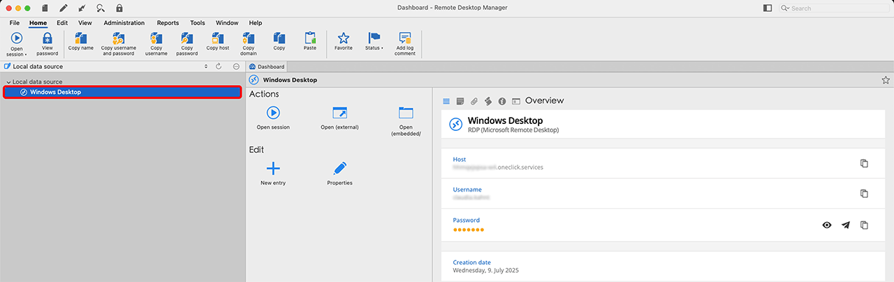 - Ein Doppelklick auf die Verknüpfung öffnet den Remote Desktop Manager. Ihre zuletzt geöffnete Sitzung wird angezeigt und kann sofort gestartet werden.