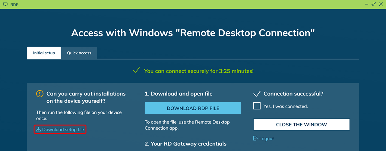 - Im Zugriffsfenster klicken Sie auf den Button RDP-Datei herunterladen..