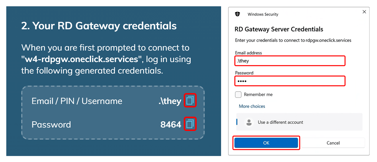 Wenn die erste Windows-Sicherheitsabfrage erscheint und Sie aufgefordert werden, Anmeldeinformationen einzugeben, klicken Sie auf Weitere Optionen und wählen Sie anschließend Anderes Konto.