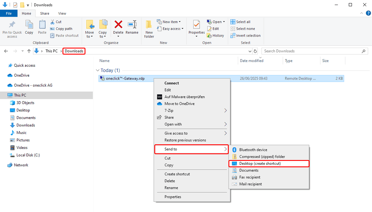 Nachdem Sie die RDP-Datei über das oneclick™ Zugriffsfenster heruntergeladen haben: