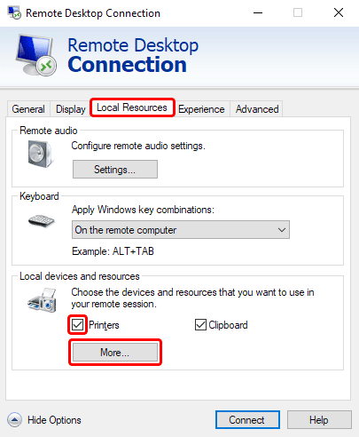 - Gehen Sie zur Registerkarte „Lokale Ressourcen“ und aktivieren Sie dort die Option „Zwischenablage“.