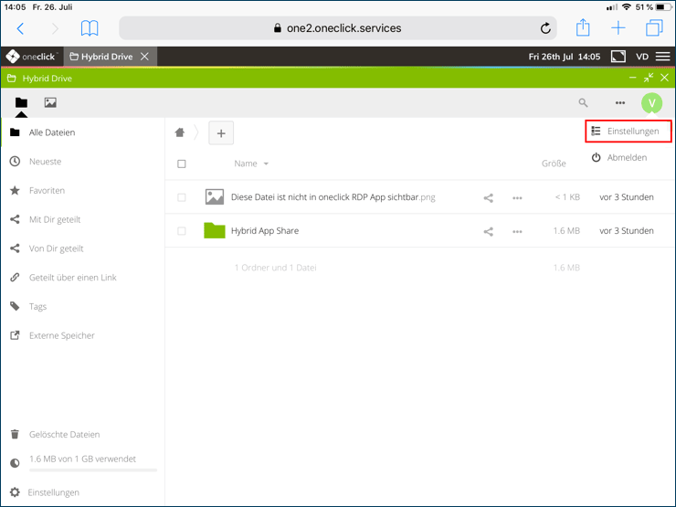- Öffnen Sie die Hybrid Drive App in oneclick™, gehen Sie auf Ihr Profilbild und klicken Sie dann auf Einstellungen.