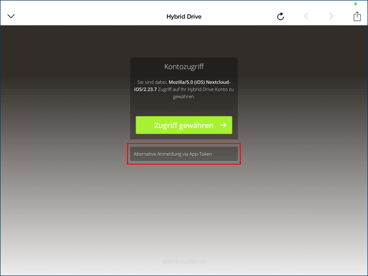 - Wechseln Sie zur Nextcloud App, geben Sie hier Ihre Anmeldedaten ein und klicken Sie auf Zugriff gewähren. Nextcloud ist nun verbunden mit Ihrem Hybrid Drive in oneclick™. Alle Dateien, die Sie in den Ordner "Hybrid App Share" legen, können Sie innerhalb Ihrer oneclick™ Windows RDP Apps über das Laufwerk "Hybrid App Share auf oneclick" abrufen.